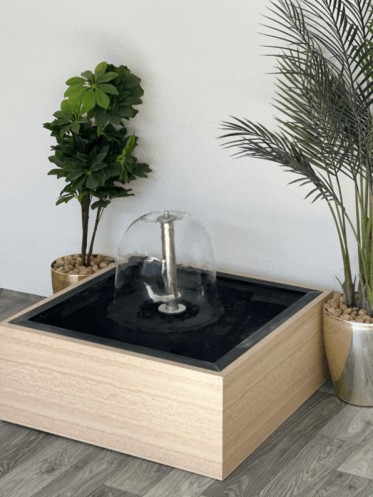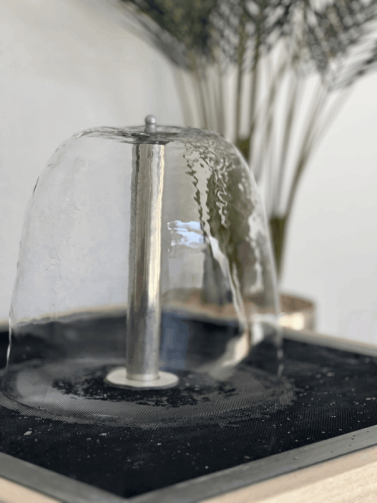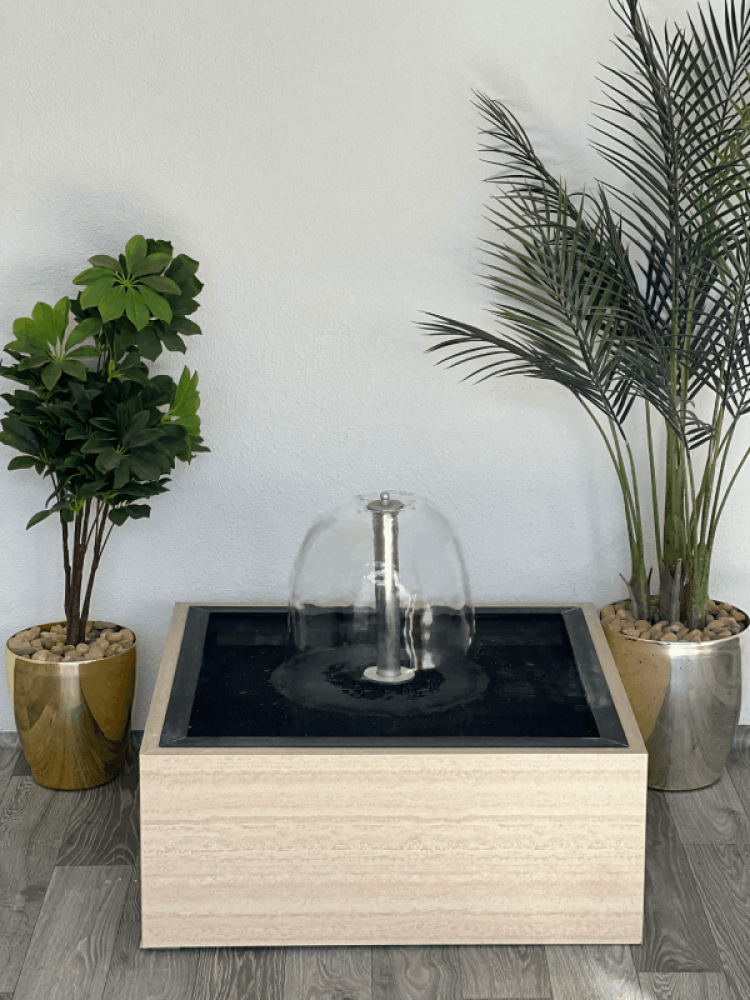 تم تصميم هذه النافورة بحيث تضفي على المكان روح الفخامة والجمال. تعمل النافورة بنظام ضخ قوي يسمح للماء بالتدفق بشكل هادئ وجذاب من الأعلى مع خلق صوت مميز يضفي على المكان أجواءً من الهدوء والاسترخاء.